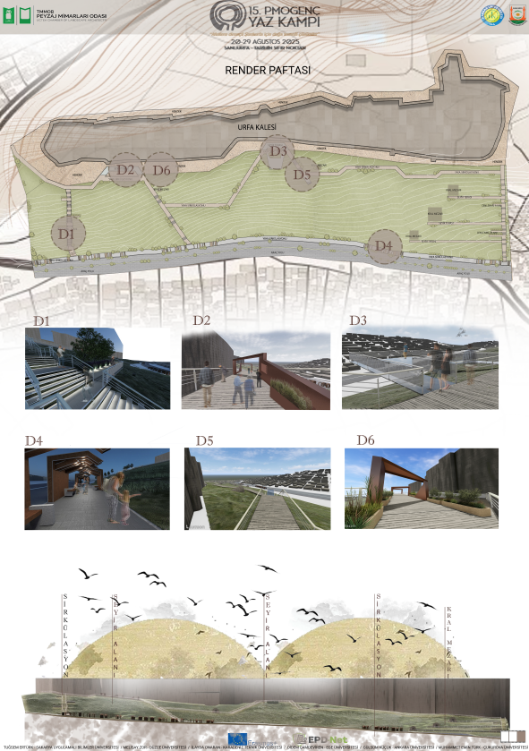 Tuğsem ERTÜRK ve ekibi ise Kale Eteği bölgesinde tarih ve doğayı buluşturan bir tasarım geliştirdi. Kral mezarlıkları ve tarihi dokuyu koruyan yükseltilmiş yaya aksları, cam teraslar, hem gündüz hem gece kullanılabilen sürdürülebilir bir peyzaj rotası olarak yeniden kurgulandı. Aynı zamanda projede, Balıklıgöl gibi çevredeki önemli turistik alanlarla mekânsal bütünlük kurarak bölgenin turizm potansiyelini artırmak amaçlandı.