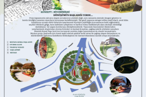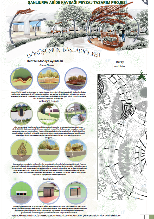 Neslihan ŞAHİN ve ekibi, Abide Kavşağı için biyomimikri temalı insan odaklı bir proje tasarladı. Yayaların güvenli geçişini sağlayan bir yaya köprüsü, yaprak formunda gölgelikli oturma alanları ve kurakçıl bitkilerle oluşturulan yeşil düzenlemelerle kavşak, sosyal ve ekolojik bir kent meydanına dönüştürüldü.